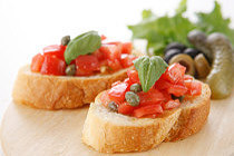 Baguette kross toasten, darauf die Knoblauchzehen abreiben. Dann die angemachten Tomatenwürfel auf den warmen Brotscheiben verteilen und servieren.